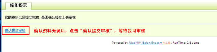 确认提交审核之后,提交备案成功.等待我司审核